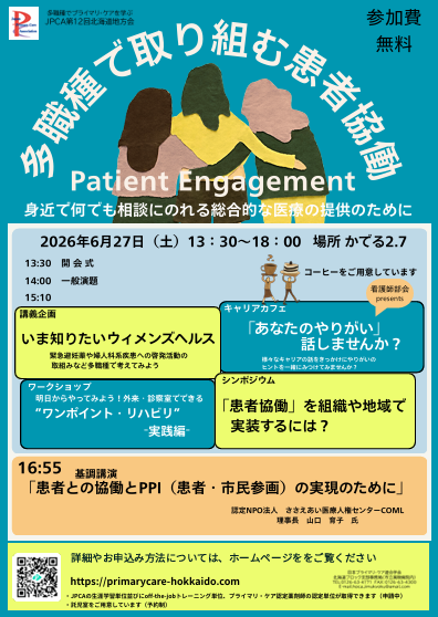 このたび、第12回日本プライマリ・ケア連合学会北海道地方会を、2026年6月27日(土)に札幌市「かでる2・7(中央区北2条西7丁目、TEL:011-204-5100)」にて開催いたします。本年度のテーマは、「多職種で取り組む患者協働 ~Patient Engagement~」です。患者さんが主体的に健康づくりに関わるためには、医師・看護師・薬剤師・リハ職・ソーシャルワーカーなど多様な専門職が力を合わせ、チームとして支援する姿勢が欠かせません。本地方会では、各職種がどのように協働し、患者・家族とともにより良いケアを実現していくかを、多面的に考える場としたいと考えております。